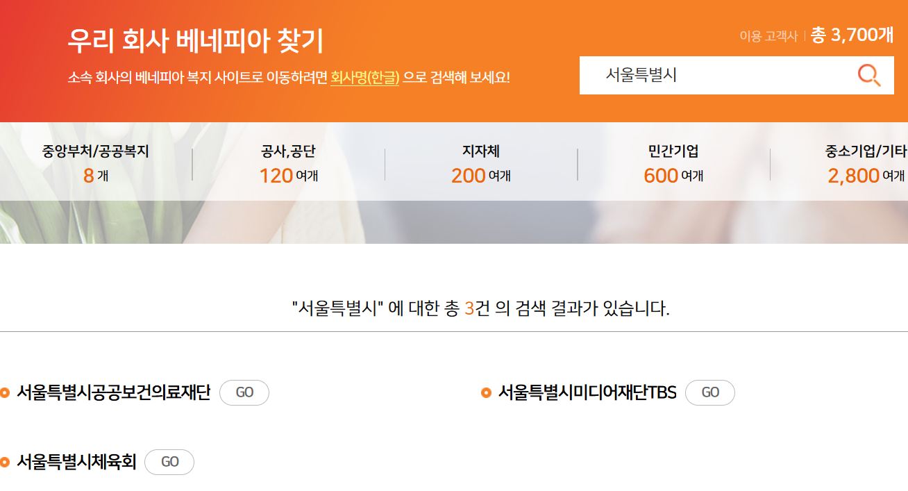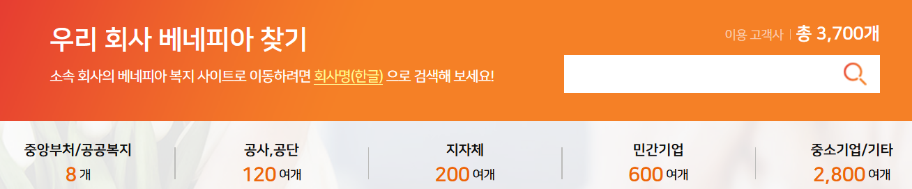 베네피아 복지몰을 이용하기 위해서는 소속 기업이 베네피아와 제휴되어 있어야 하며, 회원가입은 기업에서 부여한 사번과 인증 절차를 통해 진행됩니다. 베네피아는 현재 약 3,700개의 고객사와 제휴를 맺고 있는데요. 우선 우리 회사가 베네피아 제휴사인지를 확인해야 합니다.