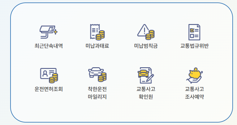 - 본인 명의의 차량에 대한 미납 과태료와 범칙금 목록을 확인할 수 있습니다.