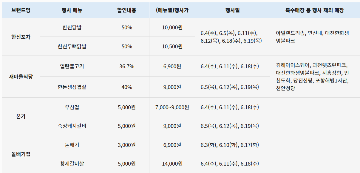 외식비가 부담되는 요즘, 맛있는 한 끼를 반값 이하로 즐길 수 있는 기회는 흔치 않습니다. 6월 한 달간 펼쳐지는 더본코리아의 릴레이 할인전을 잘 활용하면, 한 달 내내 맛있고 알찬 할인 혜택, 절대 놓치지 마세요.