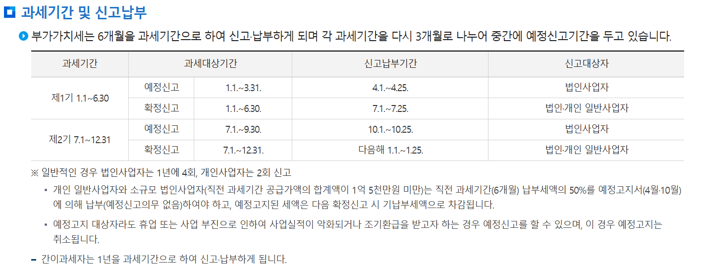 - 1기 확정신고: 1월 1일부터 6월 30일까지의 거래에 대한 부가세를 7월 1일부터 7월 25일까지 신고·납부합니다.