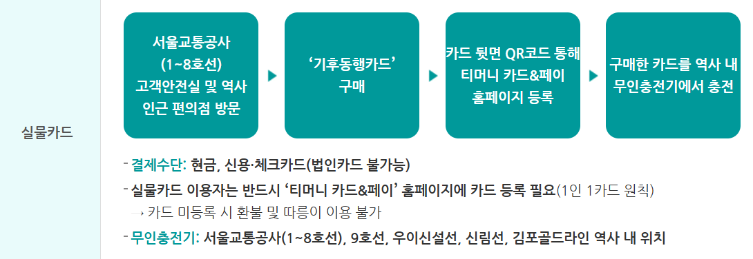 오프라인에서는 실물 카드 구매가 필수이며, 교통카드 기능이 있는 후불 신용카드나 체크카드로도 연동이 가능합니다. 실물 카드는 휴대폰 없이도 쓸 수 있어 디지털 기기 사용이 어려운 분들께 적합해요.