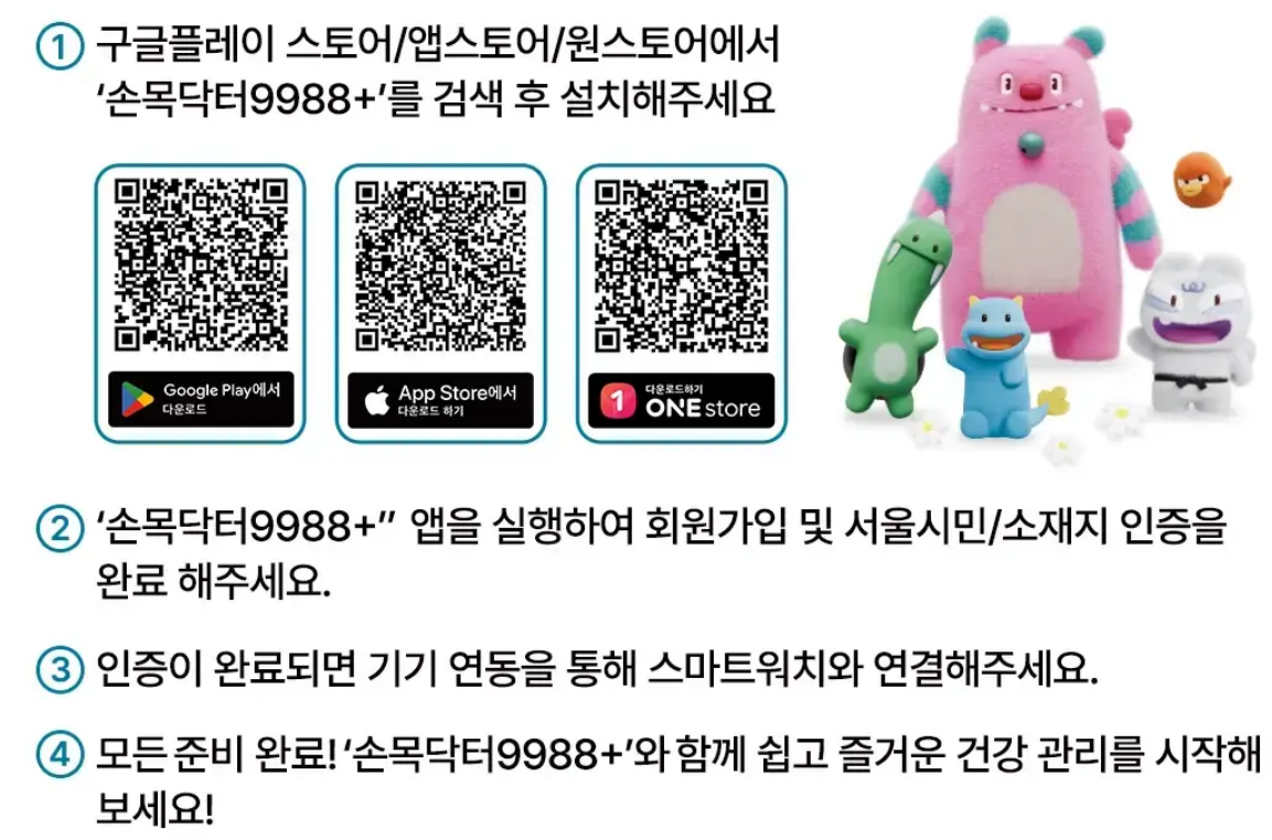 구글 플레이스토어(안드로이드) 또는 앱스토어(iOS)에서 ‘손목닥터9988’ 검색 후 다운로드